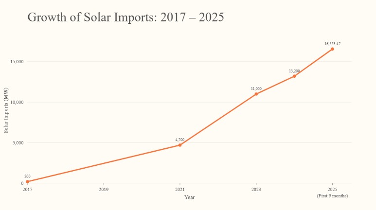 Beyond the grid, solar adoption continues to expand at a rapid pace. By September 2025, Pakistan had imported more than 16.5 GW of solar panels, reflecting several years of steady uptake across residential, commercial, and industrial users.